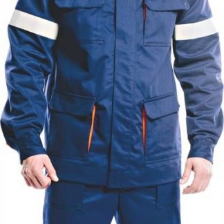 По шву притачивания кокетки спинки и полочки, на руковах и по низу брюк располагается световозвращающая термостойкая лента (СОП).