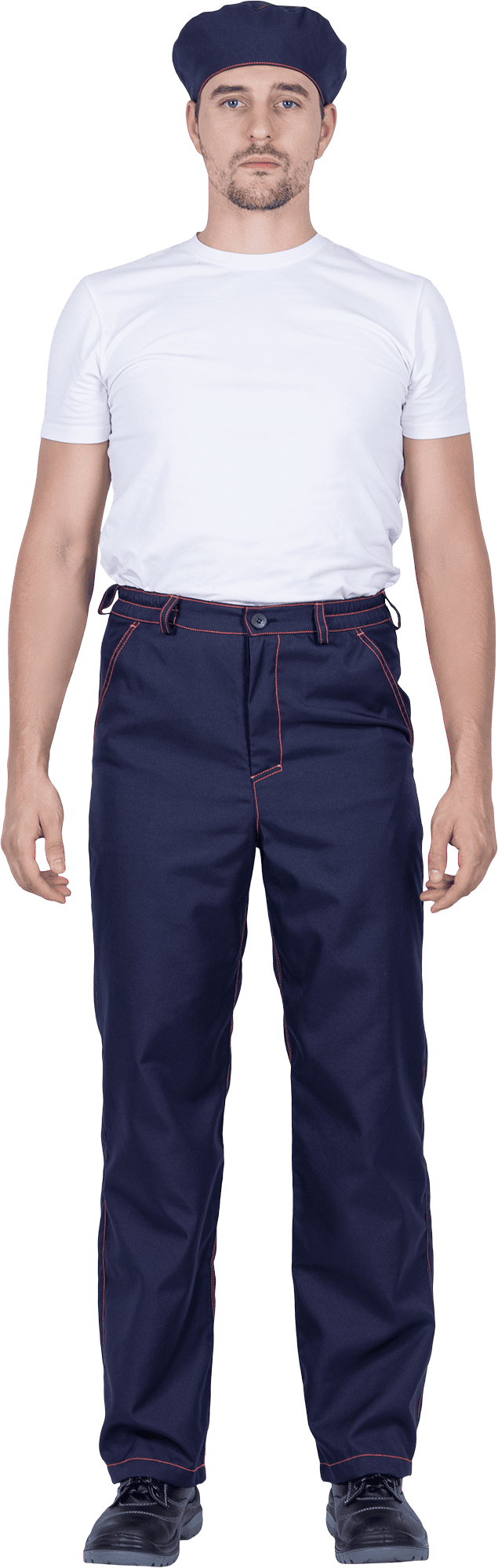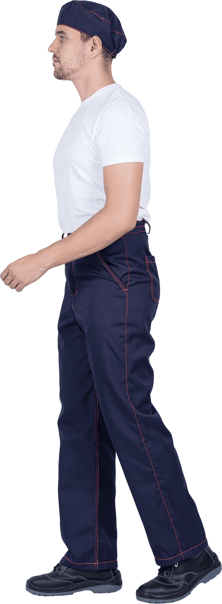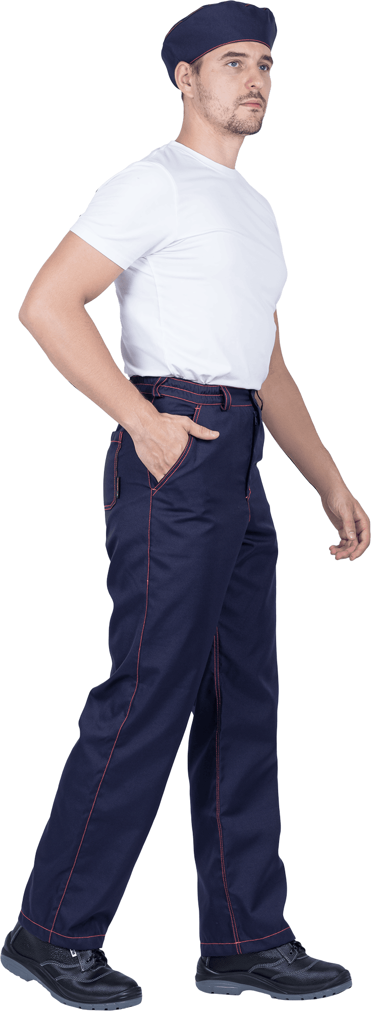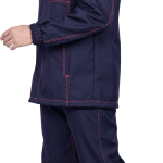 Костюм состоит из куртки, брюк и берета. Костюм с отделочными строчками контрастного цвета.